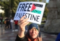 A man holds a sign during a protest in Skanderbeg Square in Tirana, against Israel's bombing of Gaza. With banners in their hands, which read We are with you, Free Palestine or Stop the bombing in Gaza, they demanded a stop to the bombing of civilians and hospitals.