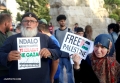 A woman and a man hold placards during a protest in Skanderbeg Square in Tirana, against Israel's bombing of Gaza. With banners in their hands, which read We are with you, Free Palestine or Stop the bombing in Gaza, they demanded a stop to the bombing of civilians and hospitals.