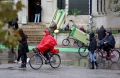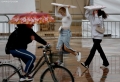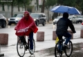 Citizens with umbrellas on bicycles on a rainy day, while the roads are flooded by heavy rains in Tirana, creating heavy traffic. Albania has been affected by the storm Ciaran which has hit Europe and in Italy it has caused several victims and great material damage. As a result of the heavy rains, traffic has been blocked on some road axes, while water has entered some homes and businesses.