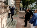 DP MPS IN THE HEADQUARTRES OF THE PARLIAMENT - MP Ervin Salianji climbing on one of the windows of the headquarters of the Parliament in Tirana. Some of the MPs of the democratic party were expelled from the Secretariat of Ethics after the tensions created during the last parliamentary session and the door has been closed. The MPs chose to enter by force through the windows or by crossing the railings.