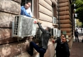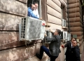 MP Ervin Salianji climbing on one of the windows of the headquarters of the Parliament in Tirana. Some of the MPs of the democratic party were expelled from the Secretariat of Ethics after the tensions created during the last parliamentary session and the door has been closed. The MPs chose to enter by force through the windows or by crossing the railings.
