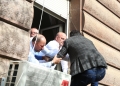 MPs Bledjon Nallbati and Lefter Geshtenja throwing a chair from the window of the headquarters of the Parliament. Some of the MPs of the democratic party were expelled from the Secretariat of Ethics after the tensions created during the last parliamentary session and the door has been closed. The MPs chose to enter by force through the windows or by crossing the railings.