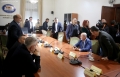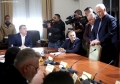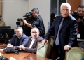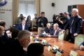 MPs leaving a session of the parliamentary committee on national security, where Member of Parliament Flamur Noka is sitting in the seat of the chairman, in this case, Nasip Naco. The latter interrupted the physical session and announced that it would take place online. After the tensions in the parliament, the opposition MPs have tried to hinder sessions of the various parliamentary committees.