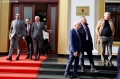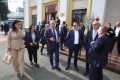 MPs Damian Gjiknuri, Damian Gjiknuri, Evis Kushi and Petro Koci leaving the parliament building after a parliamentary session where the opposition MPs lit cigarettes, while they gathered the chairs around the lectern. During the session, the deputies and ministers of the majority have approved the draft budget for the year 2024.