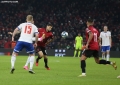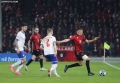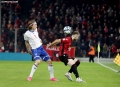 Myrto Uzuni of Albania in a duel with Brandur Olsen of the Faroe Islands during the football match, Albania vs Faroe Islands, 0-0, played at the Air Albania stadium in Tirana. At the end of the game, Albania qualified first in the group with 15 points.