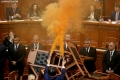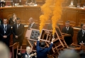 MP Flamur Noka holds smokers in hands during a parliamentary session where the opposition MPs lit smokers and set some chairs on fire, while they gathered the other chairs around the lectern. During the session, the deputies and ministers of the majority have approved the draft budget for the year 2024.