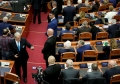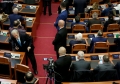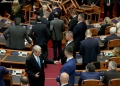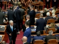 Former Prime Minister Sali Berisha leaving the group of MPs during a parliamentary session where opposition MPs lit smokers and set fire to some chairs, while they gathered other chairs around the pulpit. During the session, the deputies and ministers of the majority have approved the draft budget for the year 2024.