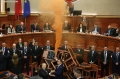 Parliament hall filled with smoke during a parliamentary session where opposition MPs lit smokers, while they gathered the other chairs around the lectern. During the session, the MPs and ministers of the majority have approved the draft budget for the year 2024.