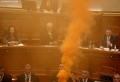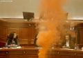 Prime Minister Edi Rama and Ministers Belinda Balluku and Elisa Spiropali at a time while MP Flamur Noka holds smokers in his hands during a parliamentary session where opposition MPs lit smokers, while they gathered other chairs around the pulpit. During the session, the MPs and ministers of the majority have approved the draft budget for the year 2024.