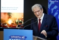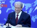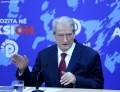 Former Prime Minister Sali Berisha speaking at a press conference in the headquarters of the democratic party. He commented on the change in the security measure for Jamarber Malltez under house arrest while attacking Prime Minister Rama for controlling the justice system.