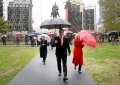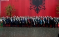 The Mayor of Tirana, Erion Veliaj and representatives of the Albanian municipalities, members of the Union of Albanian Municipalities in the Region, posing with the Albanian flag placed on the facade of the Tirana municipality, before the celebrations on the occasion of the 28 November, the 111th anniversary of the declaration of Independence.