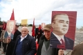 Communists with Albanian flags and posters with the image of Enver Hoxha at the Nena Shqiperi monument during the tributes at the Martyrs' Cemetery, in honor of the 79th anniversary of the Liberation of Albania.