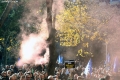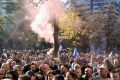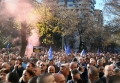 DP supporters ignite smokers and wave flags during a rally of former prime minister Sali Berisha in front of the headquarters of parliament. The rally was organized while the meeting of the council for the regulation and the mandates to examine the request of SPAK to remove Berisha's immunity was taking place, for the case of the former Partizani complex.