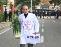 DASHAMIR SULA IN FRONT OF THE PARLIAMENT - MP Dashnor Sula, wearing a doctor's apron, which says sterilization, and a bunch of leeks in his hands, entering the parliament building before a parliamentary session.