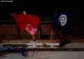 Former Prime Minister Sali Berisha waves the flag of DP and Albania from the balcony of his apartment on Mustafa Matohiti Street. Argita Berisha and Berisha's supporters gathered below the apartment in support of the former prime minister after the decision on house arrest for him.