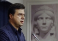 Journalist Prec Zogaj speaking during a ceremony organized for the 33rd anniversary of the newspaper Rilindja Demokratike, the official newspaper of the democratic party. During it, chairman Basha spoke about the political situation, while he tried not to comment on the measure of house arrest for former Prime Minister Berisha.