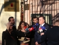 MPs Dhurata Cupi and Saimir Korreshi entering the headquarters of the parliament to take part in a meeting of the parliamentary group of the DP. The MPs who support the former prime minister Sali Berisha and the MP Gazment Bardhi were present at the meeting, while due to the security measures, Berisha did not participate.