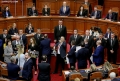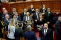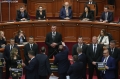 Opposition MPs blocking the floor and shouting in a moment of tension during a parliamentary session. The session marks the session of the Sixth and Tenth Legislature of the Assembly of Albania, while the appointments of Blendi Gonxhe as Minister of Economy, Culture and Innovation and Adea Pirdeni as Minister of State for Administration and Anti-Corruption were approved.