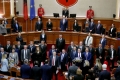 Opposition MPs blocking the floor in a moment of tension during a parliamentary session. The session marks the session of the Sixth and Tenth Legislature of the Assembly of Albania, while the appointments of Blendi Gonxhe as Minister of Economy, Culture and Innovation and Adea Pirdeni as Minister of State for Administration and Anti-Corruption were approved.
