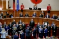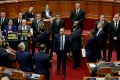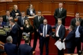 MP Ervin Salianji and opposition MPs blocking the floor in a moment of tension during a parliamentary session. The session marks the session of the Sixth and Tenth Legislature of the Assembly of Albania, while the appointments of Blendi Gonxhe as Minister of Economy, Culture and Innovation and Adea Pirdeni as Minister of State for Administration and Anti-Corruption were approved.