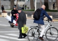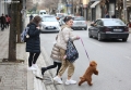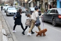 A woman with her dog and daughters, crossing a road with heavy traffic in Tirana. People are enjoying the high temperatures on this winter day sitting outside the bars and walking in the streets of the city.