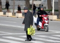 An elderly man walks on Deshmoret e Kombit Boulevard in Tirana. People are enjoying the high temperatures on this winter day sitting outside the bars and walking in the streets of the city.