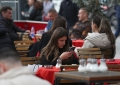 Young people drinking coffee and looking at mobile phones in a bar in the center of Tirana. People are enjoying the high temperatures on this winter day sitting outside the bars and walking in the streets of the city.