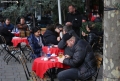 A WINTER DAY IN TIRANA - Young people drinking coffee and looking at mobile phones in a bar in the center of Tirana. People are enjoying the high temperatures on this winter day sitting outside the bars and walking in the streets of the city.