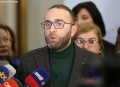 MP Gazment Bardhi speaking for journalists after the session of the electoral reform commission. The opposition MPs have blocked the session, taking the seats of the commission members, while Metaliaj and Vokshi have taken the seats of the chairpersons Gjiknuri and Alibeaj. Bardhi has attacked the MPs of the majority and the MPs who support Lulzim Basha for turning the reform into a farce.