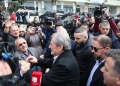 Former Prime Minister Sali Berisha speaking to journalists before entering the premises of SPAK. He has been summoned to be questioned in connection with the issue of the former Partizani complex. Berisha is suffering the house arrest security measure, as he did not comply with the obligation to appear for the same case.