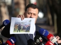 DP MP, Flamur Noka speaking to journalists after a meeting of the DP parliamentary group, with MPs who support former Prime Minister Sali Berisha. Noka showed a photo of the head of the Supreme Court, Sokol Sadushi, after placing flower crowns during a socialist party event, accusing him of being captured by the government.
