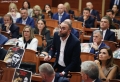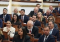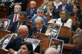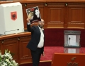 MP Gazment Bardhi holds a letter against the government at a moment of voting during a parliamentary session this afternoon. During the session, a vote was held for the position of Speaker of Parliament, where the Socialist Party's proposal, Niko Peleshi, won.