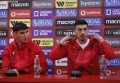 Lojtaret e kombetares shqiptare te futbollit, Qazim Laci dhe Julian Shehu gjate nje konference per shtyp para ndeshjes me kombetaren e Serbise, ne kuader te kualifikuesve per boterorin 2026.