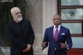 Kryeministri Edi Rama dhe kryetari i bashkise New York, Eric Adams duke folur per gazetaret jashte ambienteve te kryeministrise ne Tirane. Adams ka arritur ne Tirane per nje vizite 4 ditore.