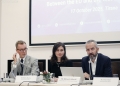 Kreu i delegacionit te BE ne Tirane ambasadori, Silvio Gonzato, Komisioneri Shteteror i Zgjedhjeve, Ilirjan Celibashi dhe Zyrtarja e Programit te International IDEA, Blerta Hoxha duke folur gjate nje konference mbi zgjedhjet e ardhshme vendore te dates 9 nentor. Gjate saj u konfirmua perdorimi i inteligjences artificiale.