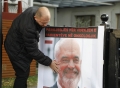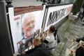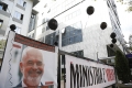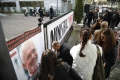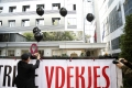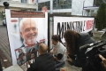 Citizens place a banner with the face of Prime Minister Rama during a protest in front of the Ministry of Health over the lack of medicines at the Oncology Department, where cancer patients are treated.