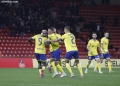 Lojtaret e Elbasanit festojne shenimin e nje goli gjate ndeshjes se futbollit Tirana - Elbasani, 1-4, e vlefshme per Kategorine Superiore, e luajtur ne stadiumin Air Albania ne Tirane.