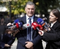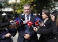 Deputeti Tedi Blushi duke folur per gazetaret para se te hyje ne ambientet e parlamentit per nje seance. Seanca eshte mbajtur pasi eshte betuar deputetja e re Briseida Cakerri dhe eshte rrezuar kerkesa per te shkarkuar kryetarin e parlamentit, Niko Peleshi.