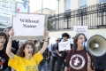 Protestues me banderola dhe pankarta gjate nje proteste para kryeministrise ne Tirane. Ne protesten qe kane marre te rinj shqiptare dhe te huaj jane shprehur kunder kampit ne Gjader dhe trajtimit te refugjateve.