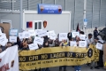 Protestues te shoqerise civile me banderola dhe pankarta gjate nje proteste para kampit te refugjateve ne Gjader. Pasi kane protesutar ne Tirane, te rinjte shqiptare dhe te huaj kane shkuar drejt kampit, ku jane shprehur kunder tij dhe trajtimit te refugjateve.