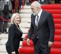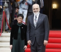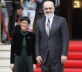 Kryeministri Edi Rama dhe Kreyetarja e keshillit te ministrave ne Bosnje dhe Hercegovine, Borjana Kristo gjate ceremonise se pritjes ne shkallet e Pallatit te Brigadave ne Tirane, para samitit rajonal Rruga jone drejt BE. Ne samit kane marre pjese perfaqesuesit e shteteve te Ballkanit Perendimor, per te diskutuar planin e rritjes se BE per kete rajon dhe rrugetimin e shteteve drejt BE.