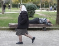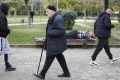 PENSINISTE GJATE PASDITES - Nje vajze shtyn valixhen ndersa disa pensioniste qendrojne ulur ne nje park ne Tirane, gjate pasdites se 2 Dhjetorit. Shume pensioniste jane drejtuar drejt pikave te postes shqiptare per te terhequr shperblimin e fundvitit. Keshilli i ministrave vendosi te jape shperblim financiar per pensionistet per festat e vitit te ri.