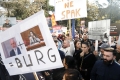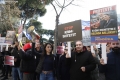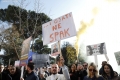 Members and supporters of the Mundesia party with banners in their hands during a protest in front of the parliament headquarters. The protesters have demanded the lifting of the immunity of Deputy Prime Minister Belinda Balluku