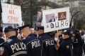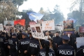 Police force Members and supporters of the Mundesia party with banners in their hands during a protest in front of the parliament headquarters. The protesters have demanded the lifting of the immunity of Deputy Prime Minister Belinda Balluku