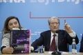 Kryetari i PD, Sali Berisha dhe deputetja Albana Vokshi gjate nje konference per shtyp ne ambientet e selise se PD. Gjate konference eshte prezantuar nje botim i dyte permbledhes me akuzat e PD per vjedhjen e zgjedhjeve 2025