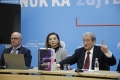 KONFERENCE E PD PAS PROTESTES - Kryetari i PD, Sali Berisha dhe deputetet Albana Vokshi e Oerd Bylykbashi gjate nje konference per shtyp ne ambientet e selise se PD. Gjate konference eshte prezantuar nje botim i dyte permbledhes me akuzat e PD per vjedhjen e zgjedhjeve 2025