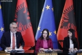 KONFERENCE PER NEGOCIATAT ME BE - Ministrja e shtetit dhe Kryenegocitarja e Shqiperise per hyrjen ne BE, Majlinda Dhuka, Ministri i shtetit per marredheniet me parlamentin, Toni Gogu dhe Ministrja e Shtetit per antikorrupsionin, Adea Pirdeni gjate nje konference per shtyp, ku eshte prezantuar paketa ligjore ne kuader te negociatave per hyrjen ne BE.