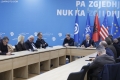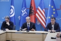 Kryetari i partise demokratike, Sali Berisha dhe deputetet Tomorr Alizoti dhe Flamur Noka duke folur gjate nje konference per shtyp. Gjate saj, ata diskutuan mbi aksionin opozitar.