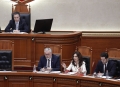 Kryetari i parlamentit, Niko Peleshi, Ministri i shtetit per marredheniet me parlamentin, Toni Gogu dhe Ministri i shtetit per marredheniet me parlamentin, Toni Gogu duke folur ne nje moment tensioni gjate nje seance parlamentare. Gjate seances, ka pasur debate dhe tension midis perfaqesuesve te mazhorances dhe opozites.