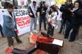 Aktiviste derdhin gjak te rreme mbi nje manekine te Presidentit te SHBA, Donald Trump, gjate nje proteste jashte Institutit te, ndersa Presidenti Donald Trump po mban takimin inaugurues te Bordit te Paqes ne Washington, DC, SHBA, me 19 shkurt 2026. Presidenti Trump ka mbledhur aleatet per te inauguruar Bordin e Paqes, institucionin e tij te ri per rindertimin ne Gaza. Me shume se njezete udheheqes boterore dhe zyrtare te larte kane ardhur ne Washington per kete takim, përfshire disa nga miqte e Trump me prirje autoritare dhe praktikisht asnje nga vendet demokratike evropiane qe tradicionalisht nenshkruajne nismat e SHBA.